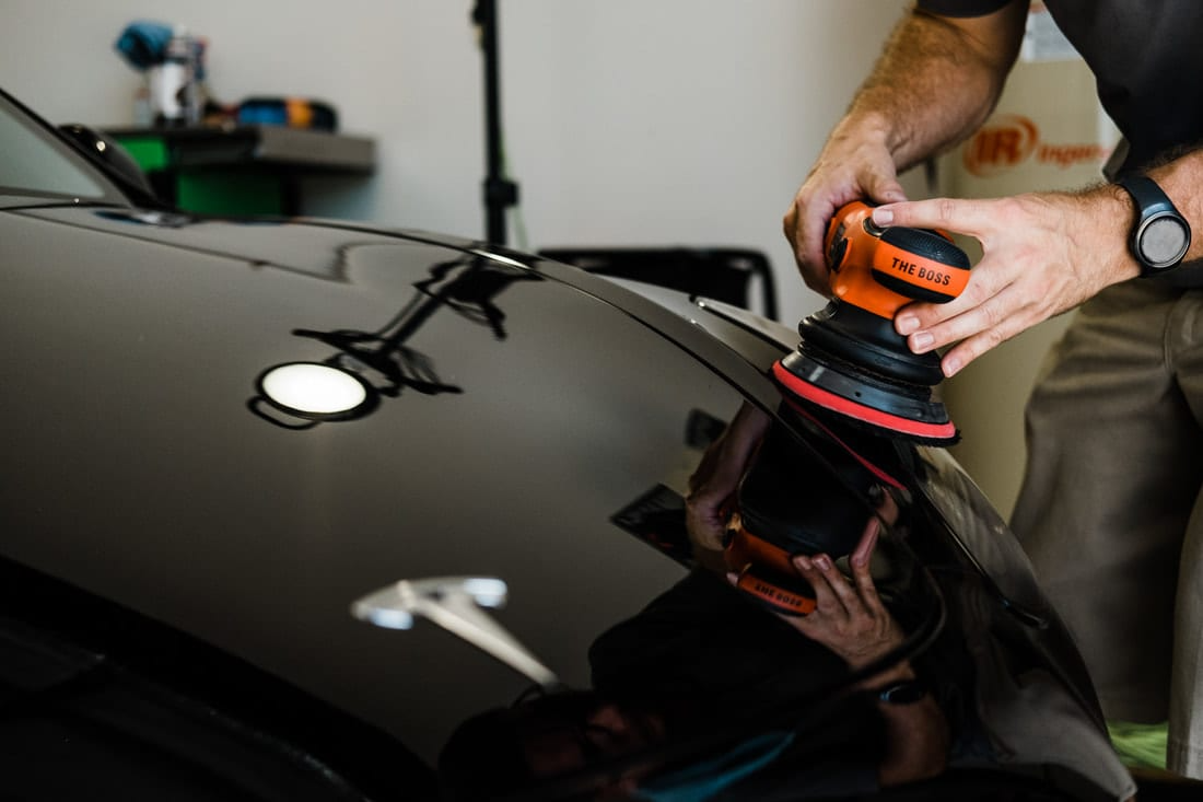 It is a careful machine polishing process that reduces swirls, light scratches, and haze to restore clarity and gloss on Tesla paint.